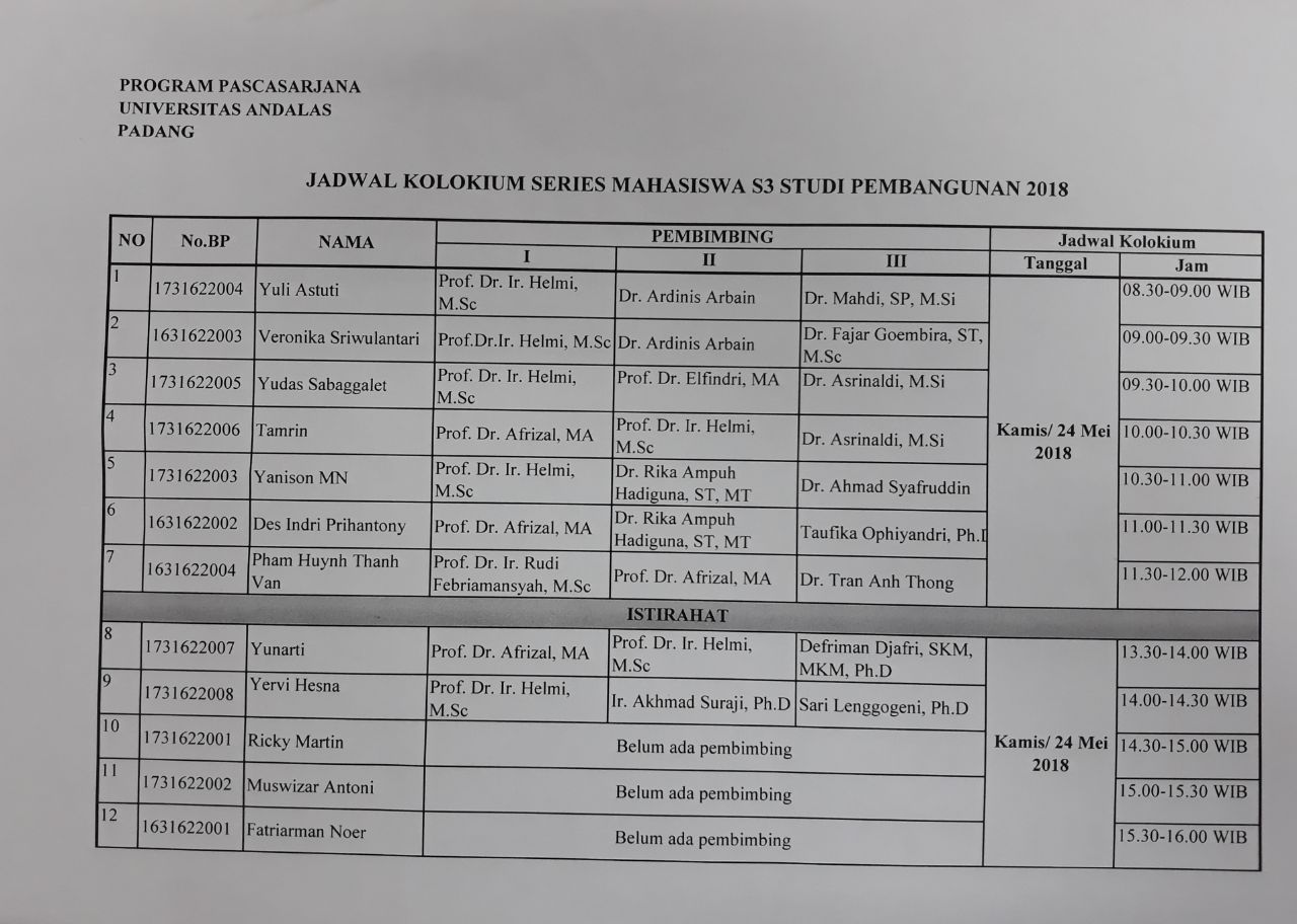 | Tempat | : | R.3.1 , Pascasarjana Universitas Andalas |