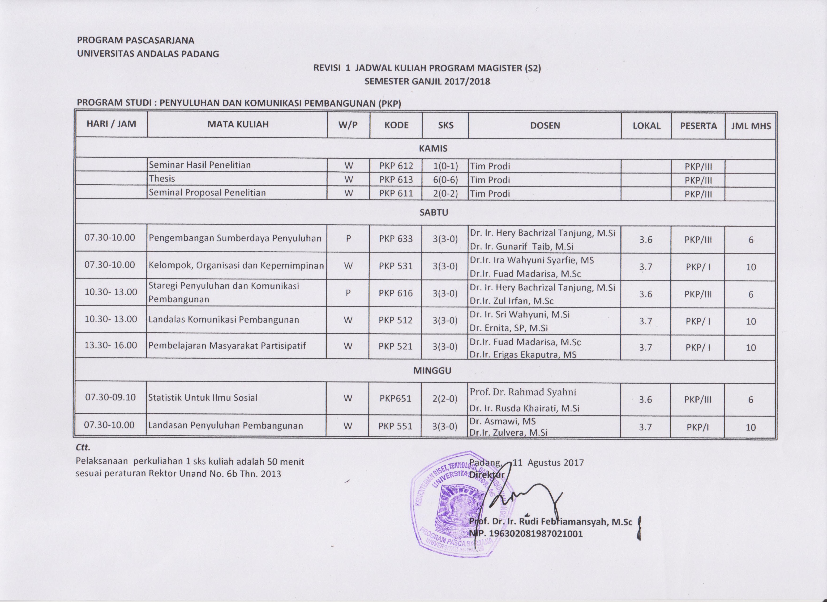 Jadwal Kuliah Program Magister (S2) PKP Semester Ganjil 2017/2018